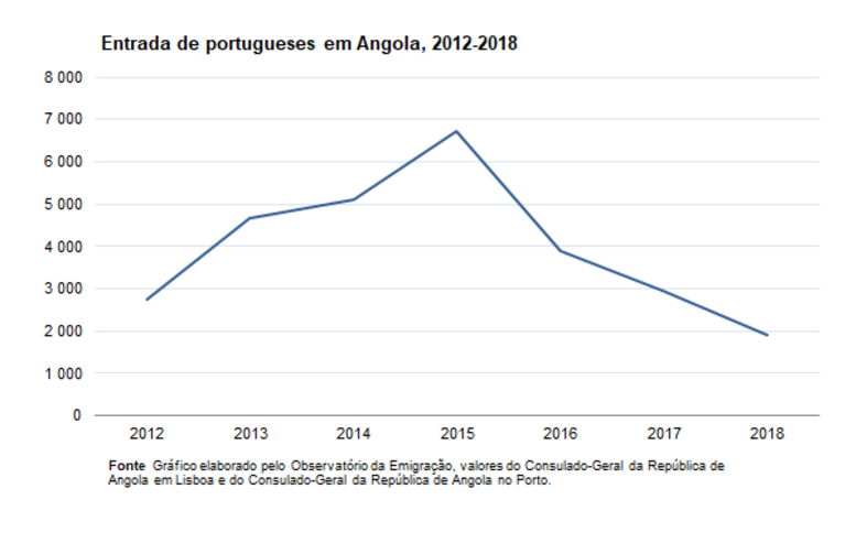 A tendência de descida tem vindo a verificar-se desde 2015, quando o número de emigrantes portugueses para Angola atingiu um máximo de 6.715 entradas. Desde então, registou-se uma descida de 42% em 2016, de 24% em 2017 e, mais recentemente, de 36% em 2018.