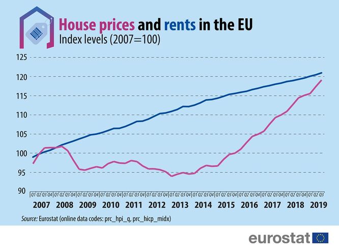 Os preços das casas aumentaram 19,1% desde 2007 na União Europeia ao passo que as rendas subiram 21%, segundo os dados divulgados esta quinta-feira, 16 de janeiro, pelo Eurostat.