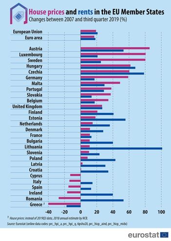 Mas nem todos os Estados-membros registaram subidas nos preços das casas. Na Grécia, o custo da habitação continua 40% abaixo do valor de 2007. Na Roménia a queda foi de 27,2% e na Irlanda de 16,7%.